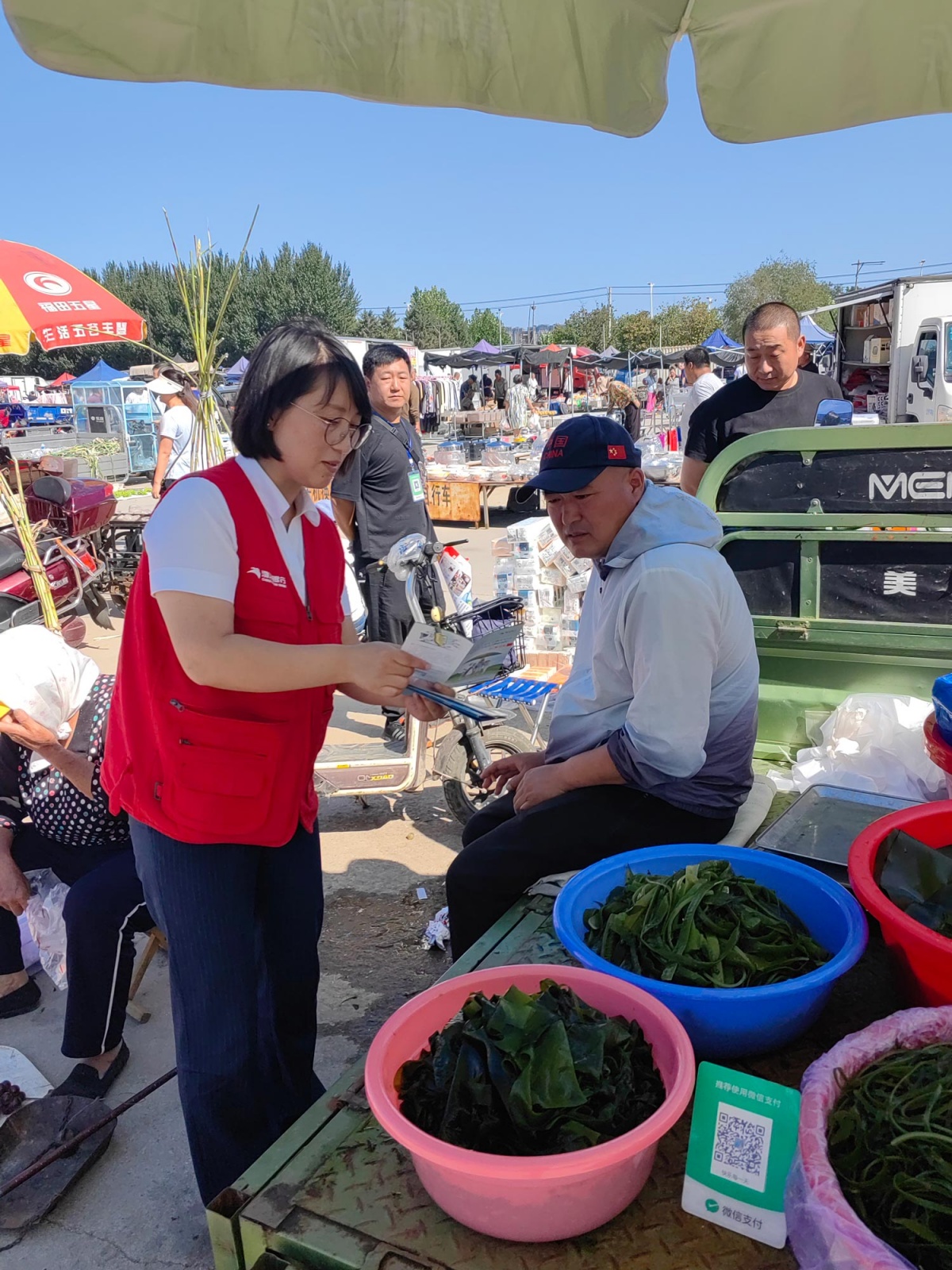 在大连,适逢营口鲅鱼圈满族红旗大集的农民丰收节,渤海银行大连分行的金融宣教团队走进营口鲅鱼圈满族红旗大集,开展“金融知识下乡”送教上门活动,向商贩们和赶集的父老乡亲们普及基础金融知识,提示金融风险,让大家在丰收的喜悦中收获金融知识的精神食粮。